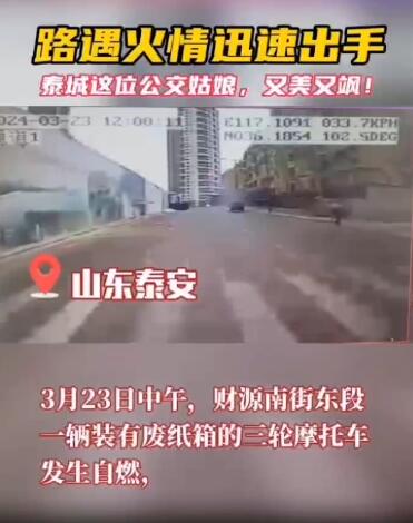 323日中午,財源南街東段一輛裝有廢紙箱的三輪摩托車發(fā)生自燃,千鈞一發(fā)之際,泰安公交第一分公司10路線駕駛員張南南拎起滅火器奔向自燃的車輛,迅速將火情控制并撲滅,得到乘客和路人的一致稱贊。