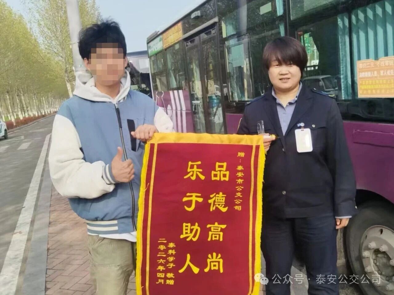 4月10日上午,泰山科技學(xué)院狄同學(xué)將一面印有“品德高尚 樂于助人”的錦旗,送至泰安公交第三分公司1路終點(diǎn)站,親手交到公交駕駛員劉俊芝手中,向熱心相助的劉俊芝及分公司工作人員、線路公交駕駛員表達(dá)誠摯謝意