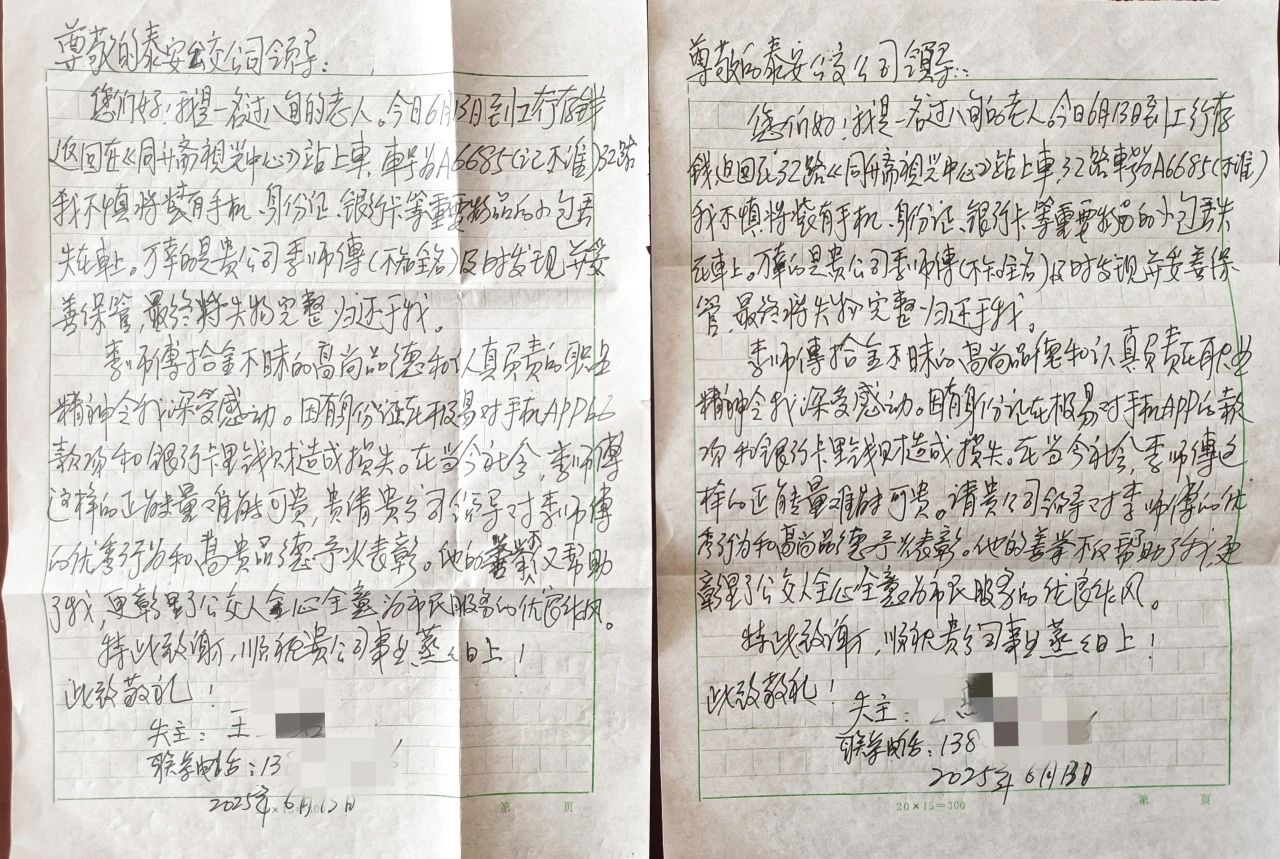 當(dāng)天,王大娘順利領(lǐng)回失物。她感慨道:“李師傅不僅拾金不昧,還主動聯(lián)系、妥善保管,讓我這八旬老太太心里特別暖。”為表謝意,老人特意手寫感謝信,一份致謝公交公司,一份致敬李師傅,用質(zhì)樸的文字傳遞社會正能量。